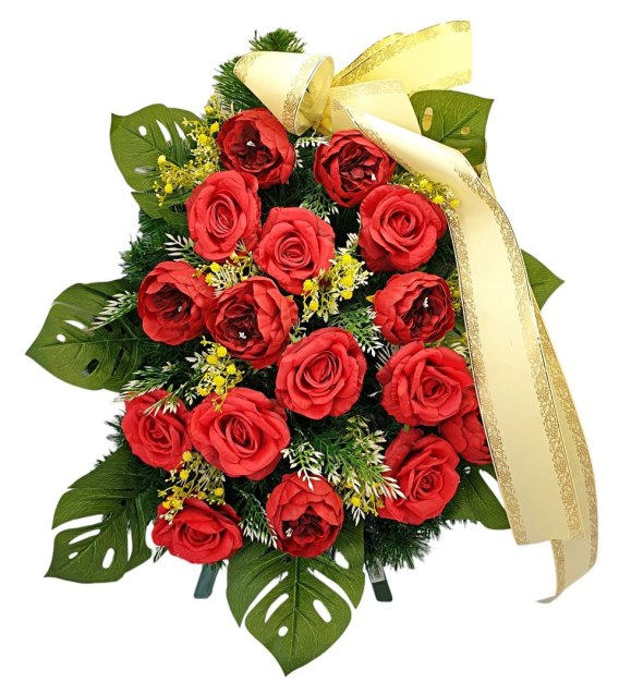 Kwiaty są integralnym elementem ceremonii ostatniego pożegnania lub jako element ozdobienia grobu, łącząc szacunek i elegancję w jednym, starannie wykonanym projekcie. Podkład wieńca jest wykonany z zielonych, gęsto splecionych gałązek PCV, które są zarówno trwałe, jak i estetyczne, podkreślając kolorystykę wiązanki.