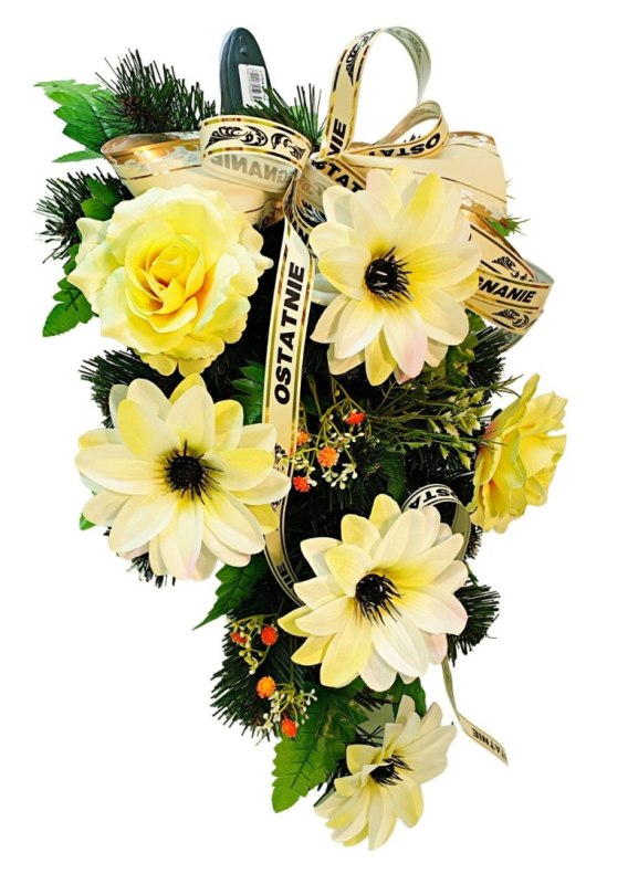 Nasz wieniec pogrzebowy cechuje się wyjątkowo gęstym splotem sztucznych gałązek iglastych, które tworzą estetycznie wyglądające tło dla unikalnej kompozycji kwiatów. Starannie dobrane kwiaty są niezwykle realistyczne i naturalne, dodając wiązance autentyczności i podkreślając jej uroczysty charakter.