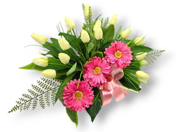 Kompozycje nagrobne z wysokiej jakości sztucznych kwiatów i roślin.
