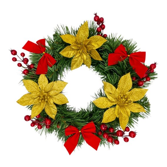 • 🔹 złote gwiazdy betlejemskie, czerwony głóg i kokardki
