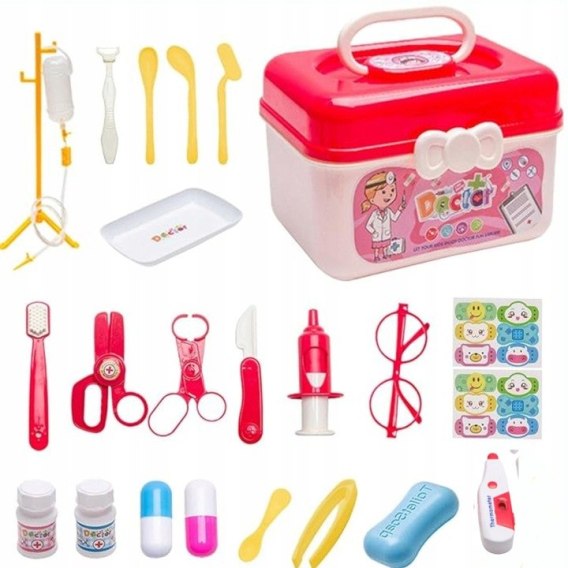 Pomocne we wcielenie się w rolę lekarza na pewno okażą się liczne, realistycznie wyglądające narzędzia medyczne, takie jak stetoskop, termometr, strzykawka, lusterko do gardła, a nawet stojak z kroplówką.