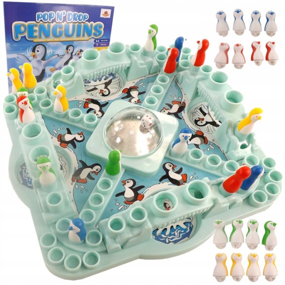 Jak grać? Na planszę należy nałożyć w odpowiednim miejscu mosty, przesuwając ruchome wkładki w mostach tak aby pułapki były niewidoczne. Każdy gracz wybiera 4 pingwiny w tym samym kolorze (żółty, czerwony, niebieski, zielony) i ustawia w swoim narożniku. Grę rozpoczyna gracz, który wyrzuci 6 oczek. Kostka jest zamknięta w półkuli i nie ma obawy, że gdzieś zaginie. Pingwiny poruszają się zgodnie z ruchem wskazówek zegara o ilość oczek wskazanych przez kostkę. Niezwykła zabawa właśnie się zaczyna !!! W czasie trwania jednej tury, każdy gracz może poruszać się tylko jednym pingwinem, chyba że za każdym razem wyrzuci na kostce 6 oczek. Wtedy może wprowadzić do gry kolejne pingwiny.