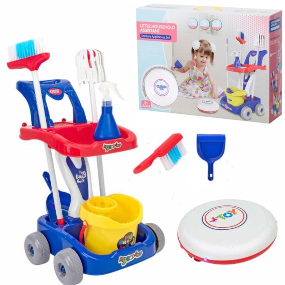 Zestaw do sprzątania posiada miotłę, którą mały gospodarz może zamieść podłogę. Dzięki szufelce z miotełką zgromadzone śmieci zostaną zebrane i wyrzucone do kosza. Następnie za pomocą mopa możemy umyć podłogę. Dodatkowo w zestawie jest robot odkurzający ze światłami i dźwiękami wyposażony jest w tajemniczy ruch, dzięki czemu rezultatem pracy będzie czysta i sucha podłoga.