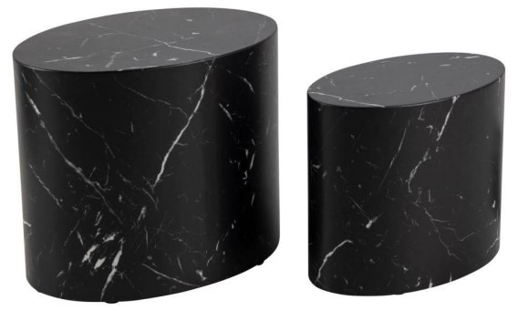 Zestaw dwóch stolików imitujących marmur to ozdoba w stylu glamour. Owalne stoliki zostały zrobione z tworzywa oraz okleiny na wysoki połysk. Okleina bardzo dobrze imutuje marmur. Dzięki zastosowaniu ekkich i trwałych materiałów, stoliki możemy łatwo przestawiać obok lub przed kanapę. Stoliki nie odbarwią się tak jak naturalny marmur. Łatwo się je czyści. Zestaw składa się z dwóch stolików. Wymiary: 33 cm x 48 cm x 40 cm 24,5 cm x40 cm x33 cm Waga: 8 kg. Wymiary kartonu: 44cm x 37cm x 51cm